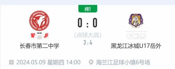 5月9日14:00,在延边赛区海兰江足球小镇6号场,湖南童记三利和食品有限公司赞助的黑龙江冰城U17岳外队,在2024第三届中国青少年足球联赛(男子高中年龄段U17组)北区预选赛中首战告捷,以4:3战胜长春市第二中学队。