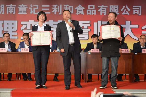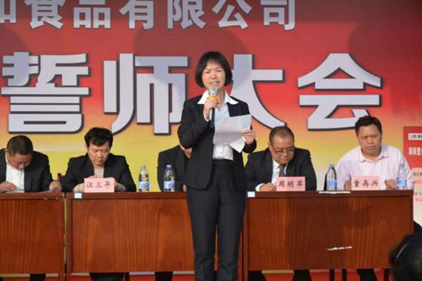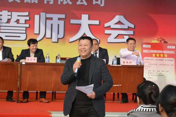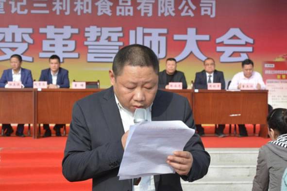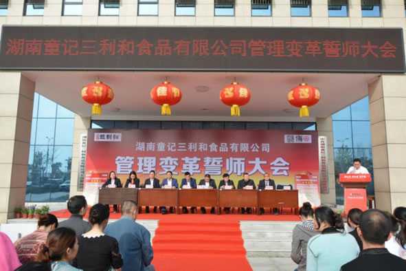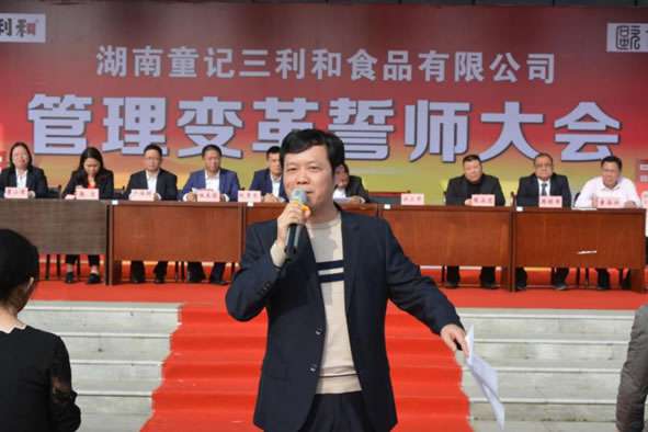 会议由副总经童再兴主持。下午16:00,大会在明快雄壮的《歌唱祖国》歌声中拉开帷幕,公司董事长童琦先生庄严宣布“湖南童记三利和食品有限公司管理变革誓言大会”正式开始,并发表热情洋溢的讲话。童总首先感谢全体员工一直以来的辛苦付出与共同努力,才有了公司今天良好的发展势头;同时介绍了在面对人民日益提升的生活质量水平与日趋激烈的市场竞争,公司今年又投入2500余万元用自动化建设,并携手企业管理咨询专业机构——欧博企业管理研究所,在生产硬件优化与管理软件完善两方面双管齐下,在变革中实现转型、在转型中促进升级,全力以赴“抓变革、提质量、促发展”,以高质量回报消费者、以高利差回报经营者、以高待遇回报各员工。