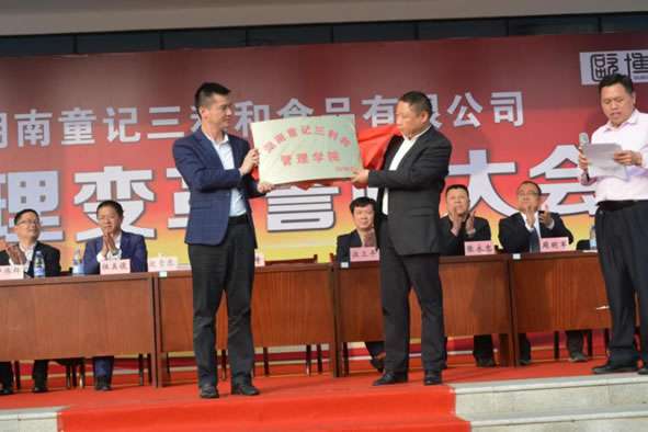 2019年3月29日,阳光格外明媚,久违的太阳穿越云雾温暖地抚摸着大地,到处散发着勃勃生机。公司内外旗帜飘扬,歌声嘹亮,庄重、喜庆的“湖南童记三利和食品有限公司管理变革誓师大会”背景醒目地矗立在行政办公大楼门楹前,欧博企业管理研究所总裁赵贵忠,欧博驻童记三利和项目组老师伍美俊、卢伟群,童记三利和董事长童琦及公司全体高管团队依次就座在主席台。
