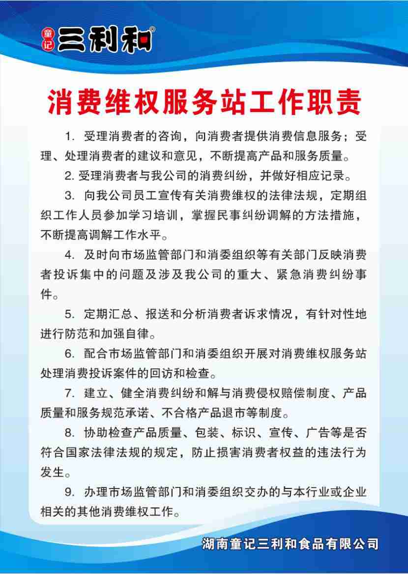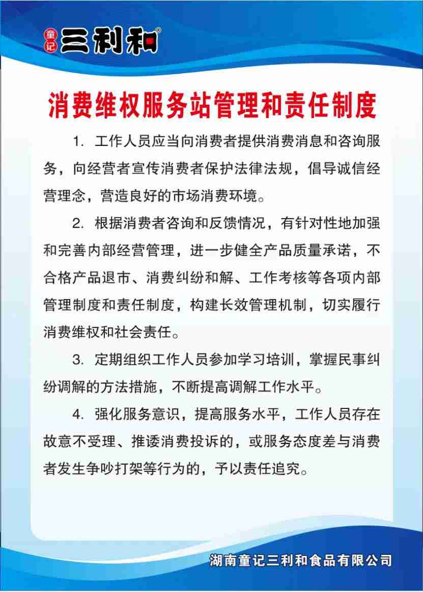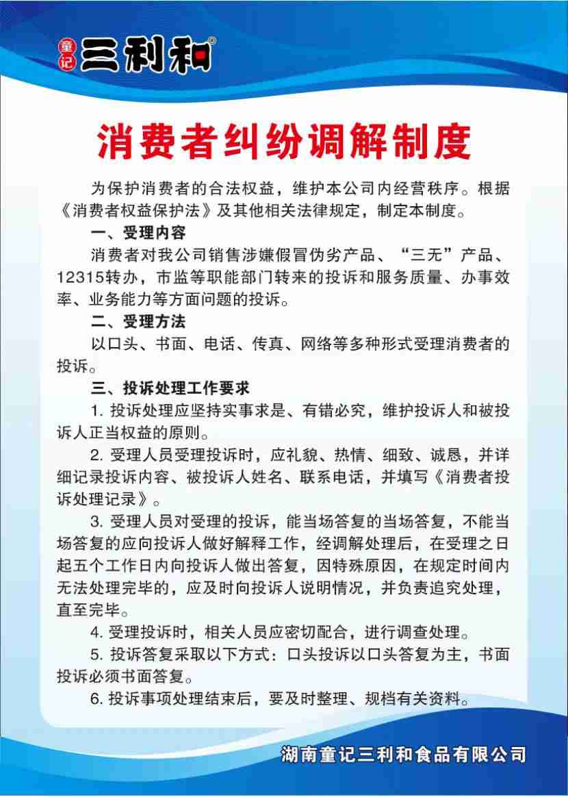 三、建立消费者投诉处理制度。经营者要建立消费调解机制。企业主要负责人要负总责,明确设立“消费维权投诉服务站(岗)”等消费维权机构,设立投诉、纠纷处理专用电话。落实岗位、人员及职能责任,积极探索利用通信、网络、微信等社交平台,构建消费维权快捷通道,及时依法妥善处理消费纠纷。