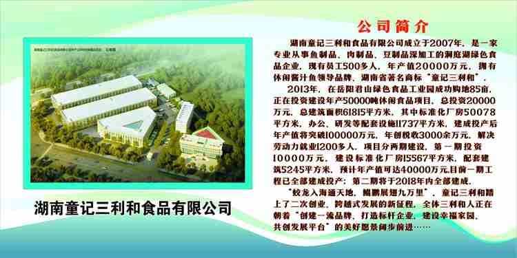 当日上午9点30分,考察小组一行三十多人来到我公司君山新厂。面对新建的生产大楼,董事长童琦先生就我公司生产与建设情形进行了详细的介绍。湖南童记三利和食品有限公司成立于2007年,是一家专业从事鱼制品、肉制品、豆制品深加工的洞庭湖绿色食品企业,现有员工500多人,年产值2亿元。2013年,在岳阳君山洞庭湖绿色食品产业园成功购地85亩,投资2亿元建设年产5万吨休闲食品项目,一期工程已于今年6月把投产试运营,二期工程将于2018年年底竣工投产。